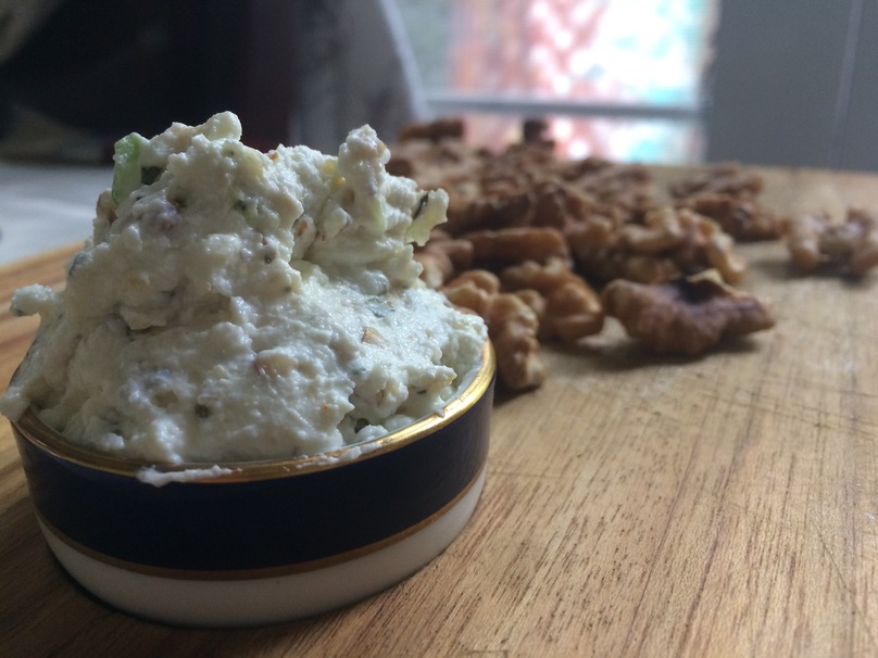 Pound the Walnuts into smaller pieces but NOT a powder. They will give texture to the dip.