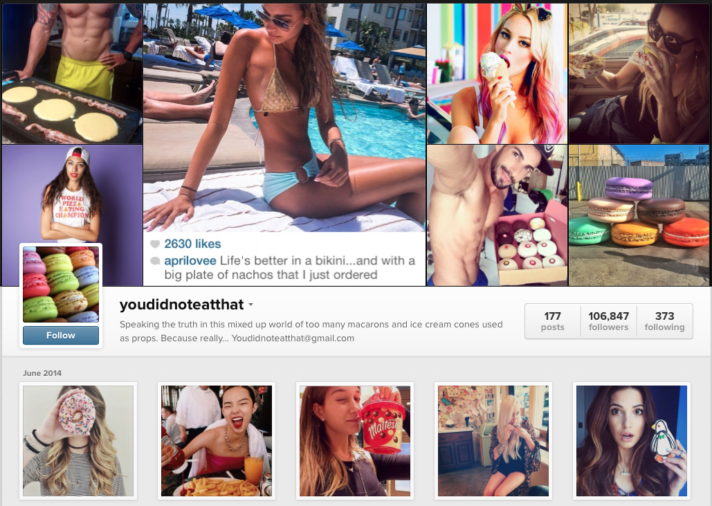 Let me explain. @YouDidNotEatThat is an Instagram account with 106,000 followers that runs on the whole premise that healthy, skinny, slim, attractive (whatever) women who take pictures of or with food do not actually eat it, but only use it as a prop. Yeah, this account makes fun of food Instagrams and our obsession with taking pictures of food (which is real but whatever) but it only focuses on women, which can be taken the wrong way and once again, further associate women with body image and weight. Some of the photos make sense, because they are either jokes with the person in the photo tagged or “idealized” airbrushed photos of a model pretending to eat a burger or a poorly photoshopped doughnut in an ad.