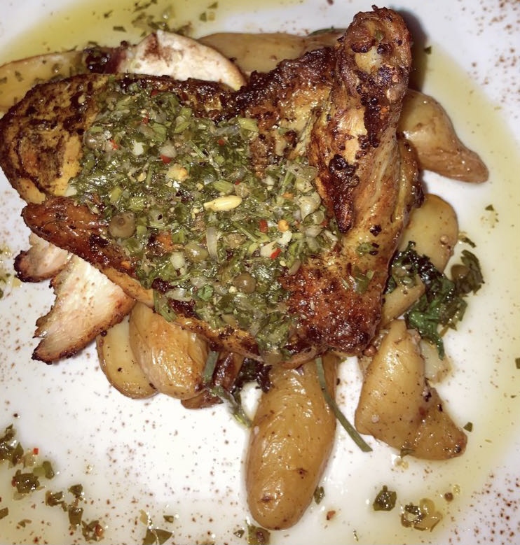 For our main dishes, we tried the Avocado + Quinoa Salad, the Duck Breast, the Springer Mountain Farms Chicken Breast, and the Burger, sharing all four plates. The salad had a very tangy sauce which may not be for everyone, but I loved how the sour taste complemented the avocados. The one element that could be improved is the quinoa to arugula ratio; though I'm all for quinoa, it overpowered the greens a bit, which I personally don’t love in a salad. The chicken breast was cooked to perfection, containing a sauce that made it very easy to devour, and it wasn’t too dry or too tough. The burger was undoubtedly my favorite. It has everything you want in a burger: rich and hearty meat, crispy bacon, caramelized onions, and just the right amount of cheese. The burger, brussel sprouts, and fried plantains were so delectable that we had to order them again the second night. We also tried the Riverview Farms boneless pork chop, and the branzino. My mom didn’t love the branzino because it was a bit tough, but my dad really enjoyed the dryness of the palate, so that dish is definitely based on preference.