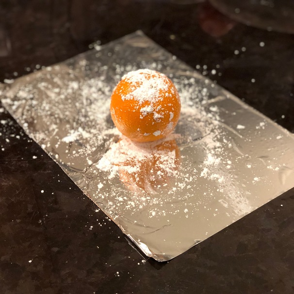 Place the orange slices (you can use as many or as few as you would like) on the aluminum foil lined baking sheet in one layer so none of them are over-lapping each other. Sprinkle each slice with a generous layer of powdered sugar. It should look like a white blanket of snow is covering the slices when you are done!