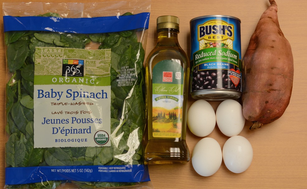 Crack the eggs into the pan, scrambling with the sweet potatoes and black beans until the yolks are almost set. Add the spinach and sauté until wilted. Serve over a tortilla if desired.