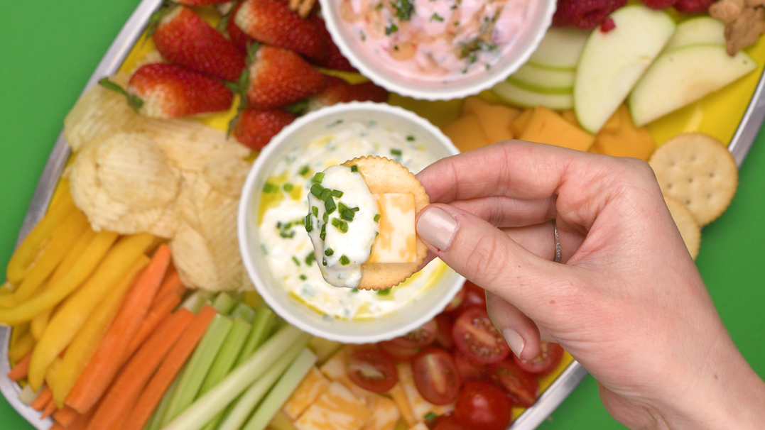 Place bowls of dip on a large tray and assemble piles of your favorite snacks like cheese, veggie sticks, crackers and fruit.