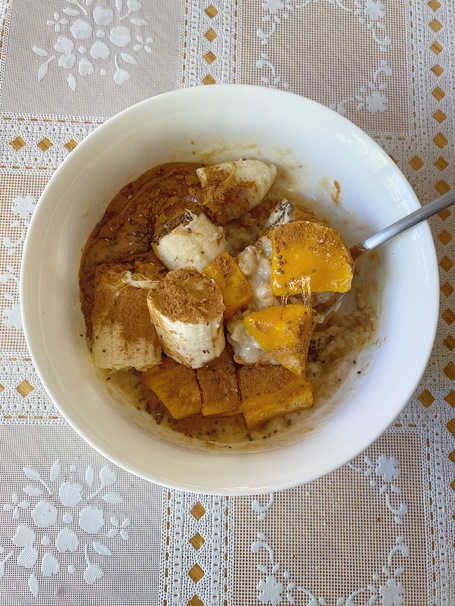 Take out and add protein powder. Mix well, then microwave for 1 minute.