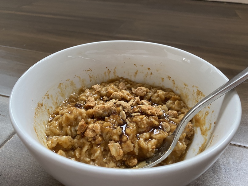 Add oats, water or milk of choice, cinnamon, nutmeg, brown sugar, ginger, and honey into a microwave safe bowl. Stir to combine.
