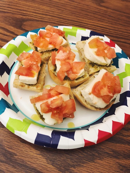 Slice mozzarella so it fits on the baguette slices, then dice tomato.