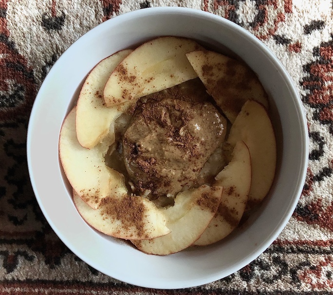 Add the oats, cinnamon, and milk into a saucepan then place it over a low heat. Stir the oats until they thicken up and absorb a majority of the milk, which should take about 10 minutes. Transfer the oats into a bowl, and top them off with big dollop of almond butter and a freshly chopped apple. This is the perfect bowl for a cozy day in.