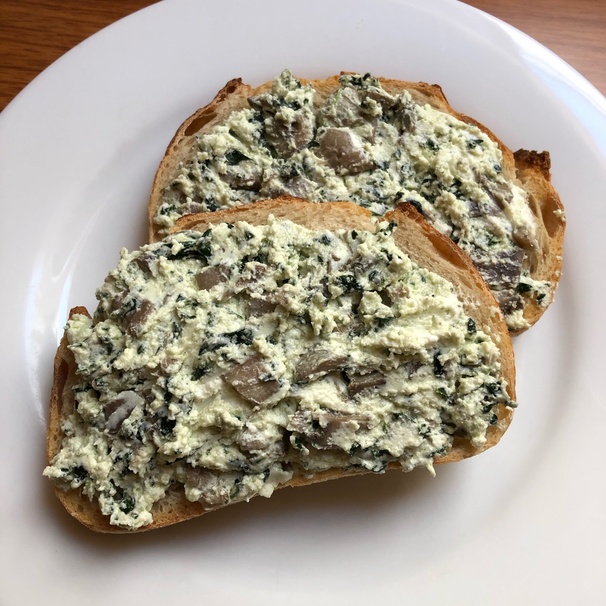 On a low to medium heat, add oil to a pan. Toss in the chopped white button mushrooms with dried sage, salt, and pepper then sauté the mushrooms for 4 to 5 minutes on each side. Stir in the fresh spinach and cook for an additional 3 minutes or until is the spinach is wilted. Then transfer the mixture into a small bowl with goat cheese, and mix the ingredients until well combined. Spread the mushroom and spinach mixture on two slices of toasted bread and enjoy with a warm cup of tea.