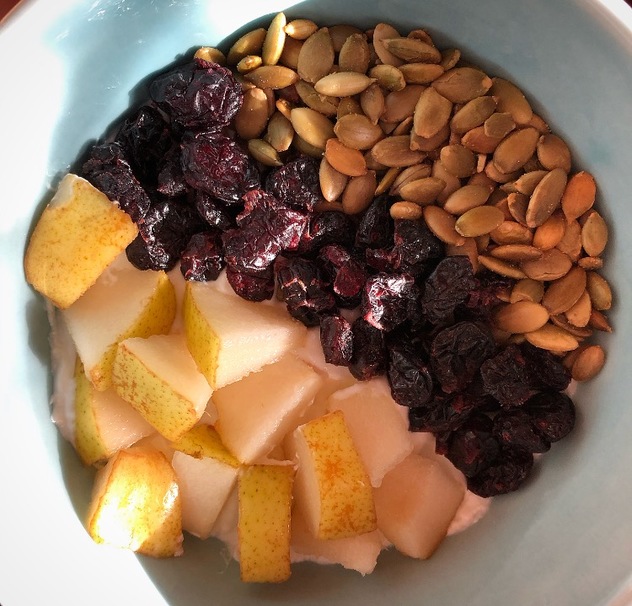 In a small bowl, mix together the greek yogurt and cinnamon until they are well combined. Top the yogurt with dried cranberries, pumpkin seeds, and a freshly chopped pear. And breakfast is served!