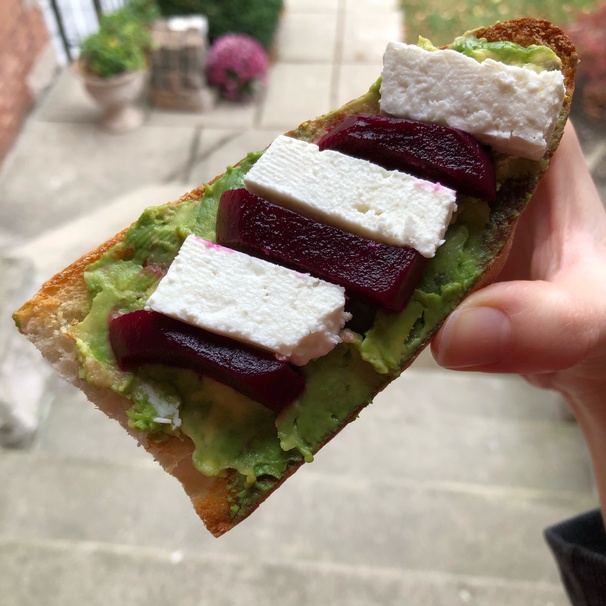 Cut a baguette in half and toast it so that it's nice and crispy. Next, take a peeled garlic clove and rub it on both halves of a baguette. Then, spread some mashed avocado on top of both slices and top off each half with sliced beets and feta cheese. This flavor combo is truly out of this world.