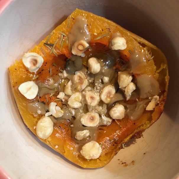 To start, wash a small butternut squash and cut to it in half. Brush the inside of each half with oil then sprinkle them with salt, pepper, and dried rosemary. On a baking sheet lined with parchment paper, place the squash face down and bake for 40 minutes at 350F. Allow the squash to cool for 10 minutes before top it off with sunflower seed butter, chopped hazelnuts, and a drizzle of honey or maple syrup. Savory and sweet for the win.