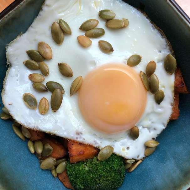 Transfer the veggie mixture into another bowl and use the same oiled pan to fry an egg. Cook the egg for 5 minutes or until preferred doneness. Top off the veggie hash with the egg and sprinkle on some pumpkin seeds for an additional crunch factor. This is better than regular potato hash, if I may say so myself.