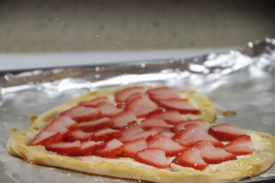 Pop the tart into the oven for 10 minutes, turning whenever you see fit to make sure that all of the edges turn golden brown. Once you take it out, sprinkle on some confectioners sugar while it's still hot and enjoy.