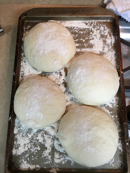 Dough should've increased greatly in size. On a floured surface, lightly knead and divide dough, as evenly as possible, into 2 or 3 pieces. These will be individual pizzas! Let stand for another hour or so.
