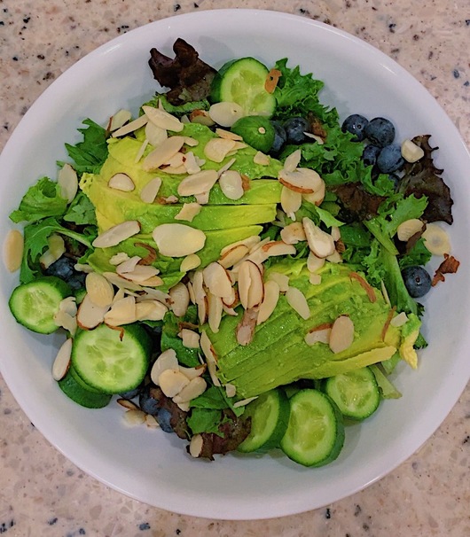 In a large bowl, assemble the spring mix or greens of your choice, the fresh blueberries, the cucumber, the avocado, and the feta.