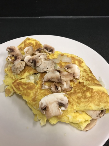 Add whisked eggs, mushrooms, and onions and sift around with spatula until all the eggs are cooked