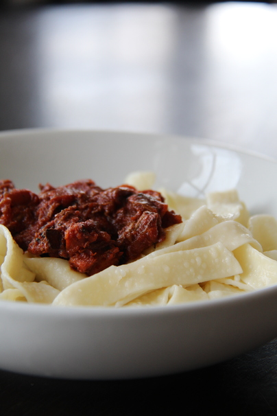 While the meat and veggies are simmering, bring a large pot of water to a boil and add pasta. I prefer to use thick pasta with ragù, but feel free to use your favorite type of pasta. I chose to use Seggiano tagliatelle organic pasta.