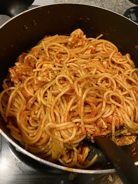 After the chicken has been in the pan for a while, pour in your marinara sauce. Stir the chicken with the marinara while all the ingredients cook. If you have some Italian seasoning, throw it in there to get that true pasta taste!