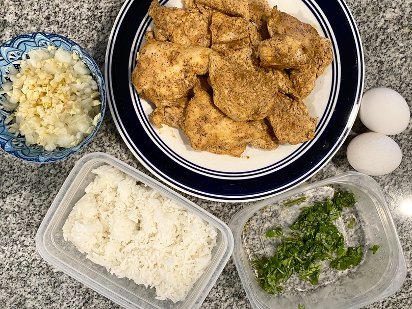 First, cook your rice how you normally would. Cook it in a rice cooker, a pot or however you want! I cook my rice in a rice cooker with some water, but do whatever is easiest for you. As your rice cooks, dice up your onions, garlic and cilantro. Set each ingredient aside. Cut your leftover chicken breast into small pieces and set that to the side as well. Then, crack your eggs in a bowl and whisk them until you get a bright yellow, creamy consistency.
