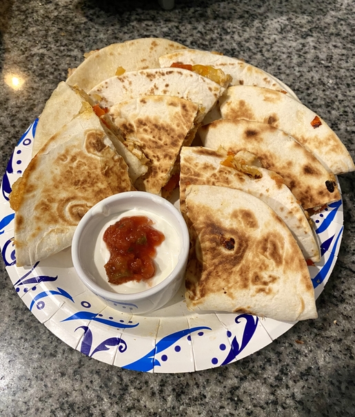 Once the chicken, vegetable and cheese have been placed on your tortilla, take a pair of tongs or spatula and fold the tortilla in half with the plain half covering the half with cheese and chicken. Cook each side of the tortilla until golden brown and crispy. Once each side of the tortilla has been cooked evenly, transfer it to a place and cut it in half. Repeat this process if you have any leftover chicken and vegetables and make more quesadillas! Serve with sour cream, salsa or sauce of your choice and enjoy!