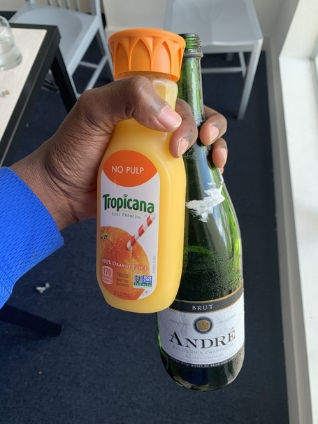 Open the bottles of champagne and orange juice. For this tailgate, we used Brut’s André (a California champagne) and Tropicana’s 100% pulp-free orange juice.