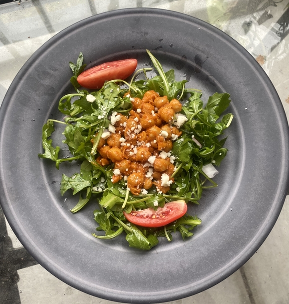 Personally, I recommend serving these spicy, little protein packages in a wrap with lettuce, blue cheese dressing, Kalamata olives, red onions, and cucumbers while they are warm. But, if wraps are not your thing, try adding them to a fresh salad and pair with chopped tomatoes, blue cheese/gorgonzola crumbles, diced nuts, and olive oil or a preferred vinaigrette. For a quick snack, the buffalo chickpeas can be roasted on parchment paper at 325° for half an hour and added to trail mix or spruced up on a charcuterie board.