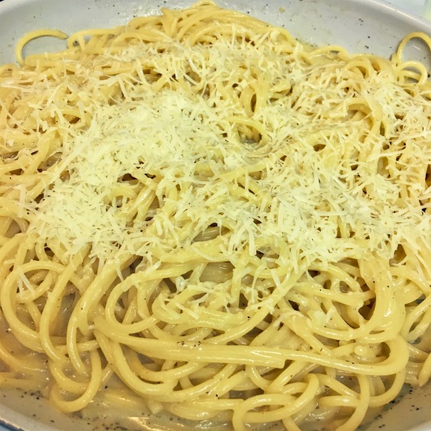 Traditionally, this recipe is very uncomplicated, using only spaghetti (along with its pasta water), Roman grated pecorino cheese, and ground pepper. The recipe below, which I adapted from Bon Appetit, is a more modern rendition which simply adds parmesan and butter to the other three ingredients.