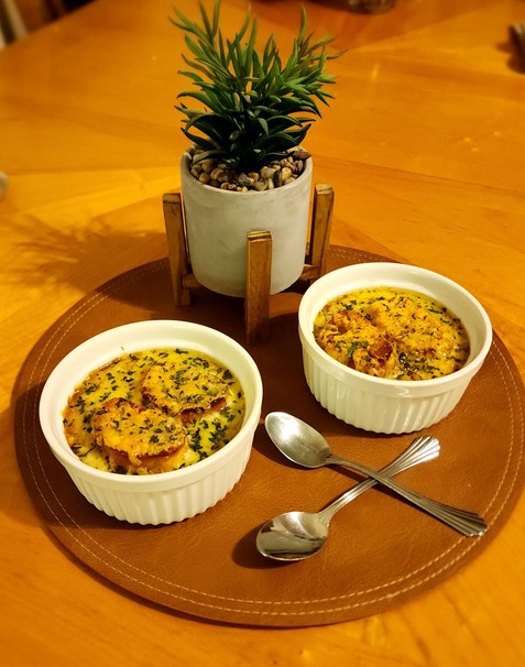 Broil the topping. Switch the oven to the broiler. Once the soup is ready to serve, place oven-safe bowls on a thick baking sheet. Ladle the soup into each bowl, and top with a baguette slice and your desired amount of cheese. Place on an oven rack about 6 inches from the heat and broil for 2 to 4 minutes or until the cheese is melted and bubbly. Keep a close eye on them so that they do not burn. Remove from the oven, and serve immediately while the soup is hot and bubbly.