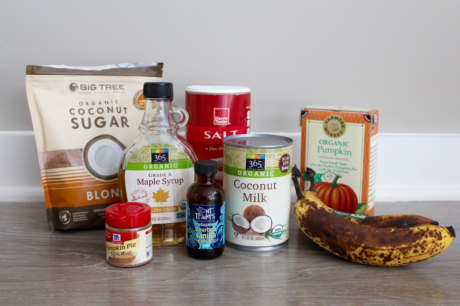 Place pumpkin, coconut sugar, 2 1/2 tsp pumpkin pie spice, and bananas in a blender or food processor.