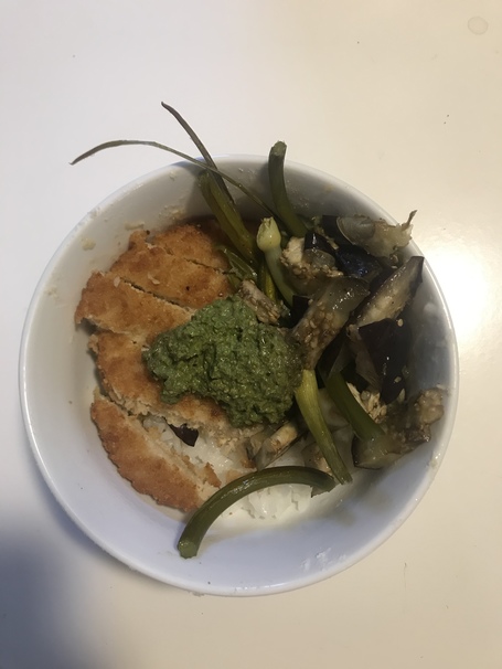In the below recipe I used Alpha Food’s Chicken Patties which is a really good brand for vegan “chicken” alternatives, I also have tried their chicken nuggets and would recommend. If you’re out of vegan chicken, use tofu and bread or bake it like in this baked tofu recipe. For the base, I used white rice (because I was out of brown) but any rice or pasta like angel hair or bow ties will do the trick. For veggies, I used tomatoes, eggplant, and garlic scapes. Other great vegetable combos include peppers, tomatoes, and onions or try asparagus, beets, and broccoli! The pesto was homemade, so check out this recipe if you want to make your own as well.