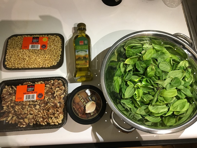 Add in about 1/4 of the olive oil and a handful of basil. Blend. Repeat until smooth.