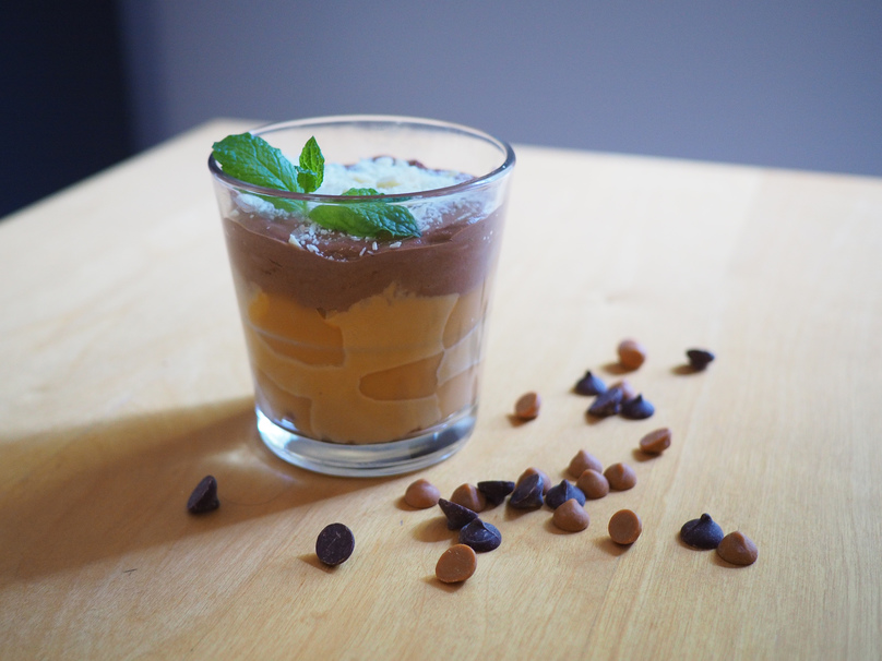 Spoon or pipe alternating layers of the butterscotch mousse and butterscotch pudding. If you are feeling ambitious, try making a checkered or spiral pattern. Lastly, spoon the chocolate mousse on top of the butterscotch layers.