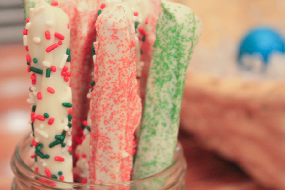 Optional: Sprinkle green and red sugar or Christmas-themed sprinkles on each pretzel rod.