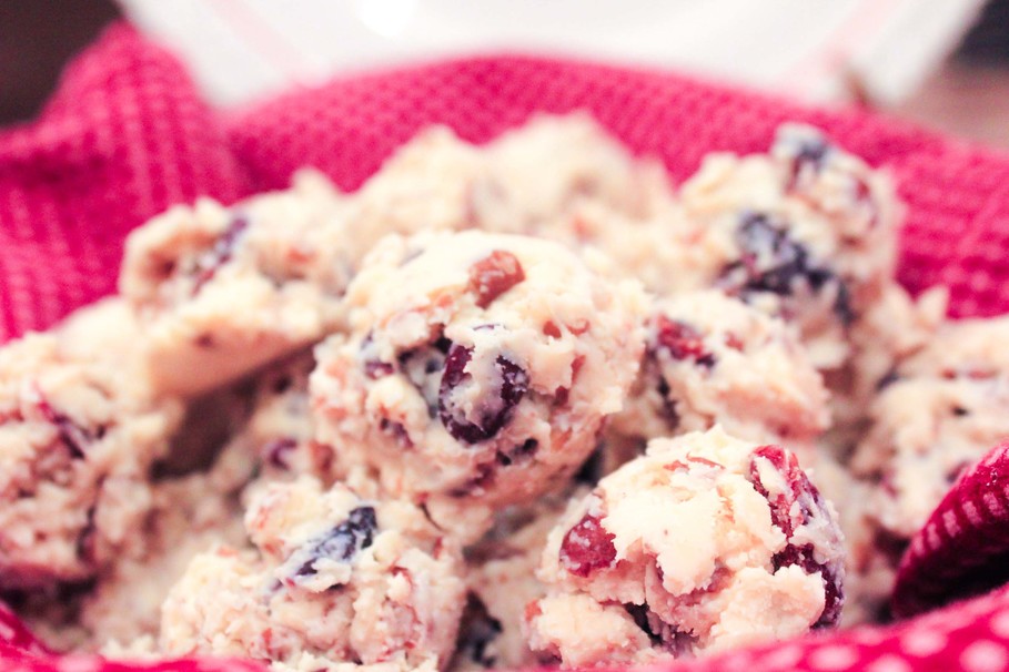 Combine the chopped pecans, dried cranberries and melted vanilla almond bark into bowl and mix together.