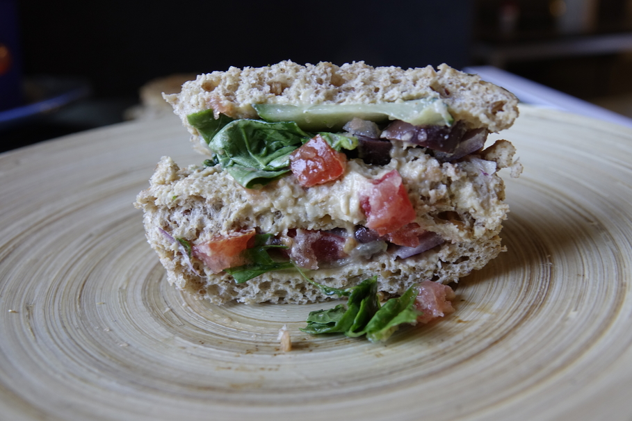Put 1 tablespoon of hummus on each slice of bread