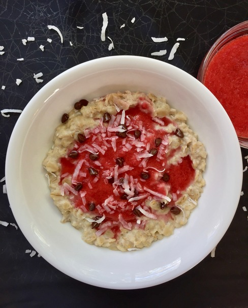 First off, I present this luxurious Vampire Oatmeal, studded with chocolate chips and glistening with a sweet, blood-red strawberry sauce. Shredded coconut "fangs" make a sophisticated addition to this elegant bowl. It's just begging you to take a bite.