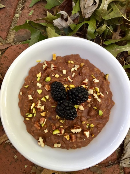 Stirring frequently, cook until the oats have absorbed most of the liquid, about 5 minutes. Turn off the heat and transfer to a bowl for serving. Top with chopped pecans, pistachios, and a handful of blackberries.