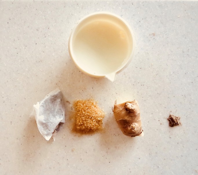 add the tea bag, ginger, and cardamom to a cup (and sugar/honey if using). once the water has boiled, wait a few seconds then SLOWLY pour into the cup. cover and let it steep for 3 minutes then take the tea bag out. i usually reuse the tea bag if i finish the cup immediately too.