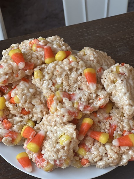 Keep stirring while adding the 6 cups of Rice Krispies cereal and the 2 cups of candy corn. Stir until ingredients are mixed well.