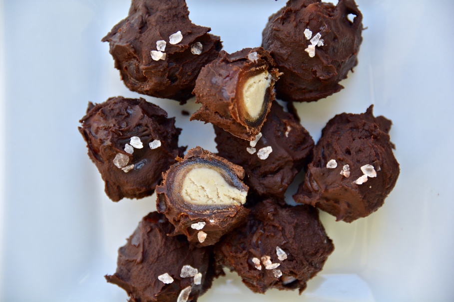 Melt your chocolate in the microwave in 20 second increments until it is melted. Coat each date ball in the chocolate, then put them in the freezer for 5-7 minutes to set. I like to sprinkle my date balls with sea salt flakes before I put them in the freezer, but this is optional.