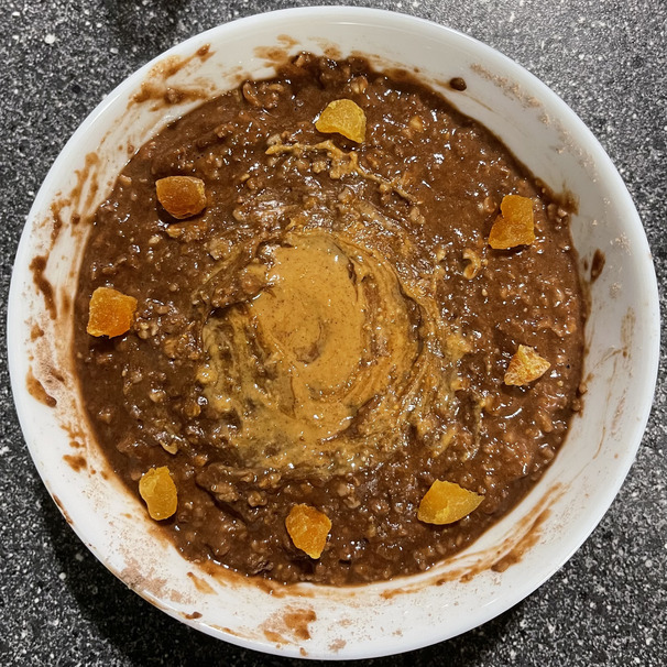 Mix the protein powder with the oats until fully incorporated. Decorate with creamy peanut butter and chopped dried apricots in whichever way you choose.
