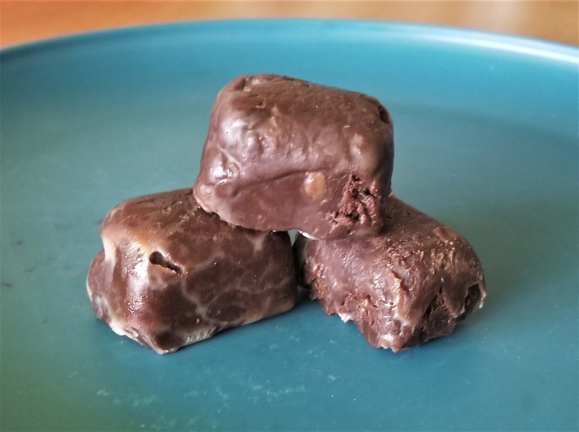 Cut or break the caramel and nougat chocolate bars into pieces and place them into a bowl.