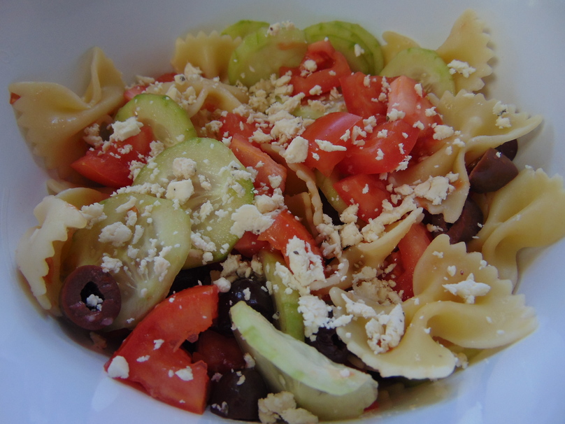 A less traditional salad, the pasta base fills you up if you want to get in some extra carbs. It is best served cold, so cook the pasta, chop the veggies and combine them with the pasta and cheese, and let sit in the fridge for an hour or two. Add the dressing immediately before serving.