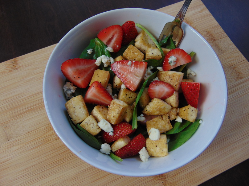 This is a perfect spring or summer salad, and if you have a sweet tooth, you'll love it. Pan fry the chicken or meat substitute, and combine with the remaining ingredients. Top it off with a balsamic or Italian vinaigrette dressing.