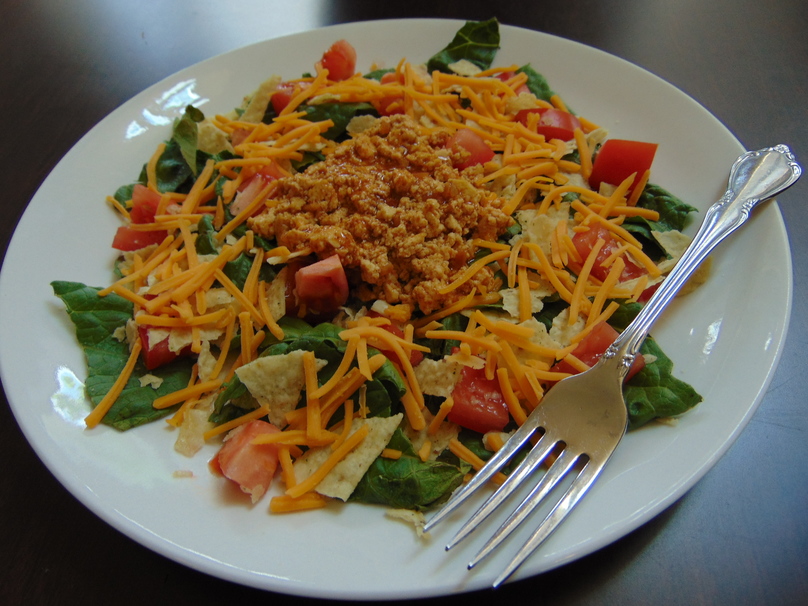 I made this salad with tofu, as I discovered that taco seasoning combined with tofu creates a delicious beef substitute. Cook your meat or meat substitute with taco seasoning until it is browned, then remove from the pan. Mix with lettuce and tomatoes, and top with cheese, chips, and taco sauce. It's just like a taco, but with a healthier lettuce base.