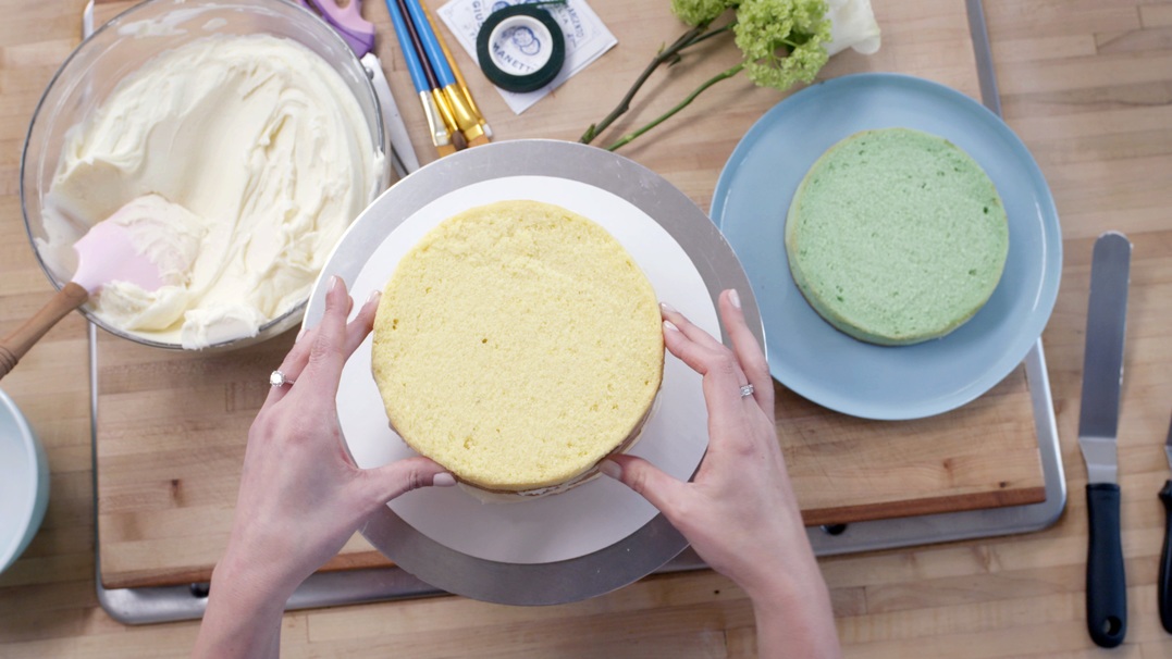 Divide evenly between the prepared cake pans. Bake for 37 minutes (or until a skewer comes out clean). Allow to cool for 10 minutes, then run an offset spatula around the perimeter of the pan to separate the cake from the pan. Place cake layers into the freezer for 45 minutes, to accelerate the cooling process.