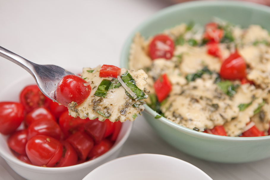 Combine ravioli, pesto with basil sauce, chopped fresh spinach, cherry tomatoes, Parmesan cheese, and fire-roasted red peppers in a serving bowl.