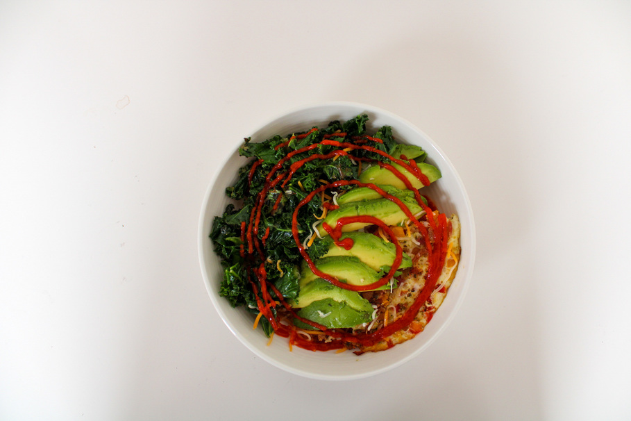 While this is cooking, place another pan over medium heat with some olive oil. Add your garlic and cook for 2 minutes. Add your kale and season with salt. Cover and cook until tender. Add your cheesy oats in a bowl, add the eggs, kale, avocado, extra cheese, and any desired toppings, like sriracha. Enjoy!