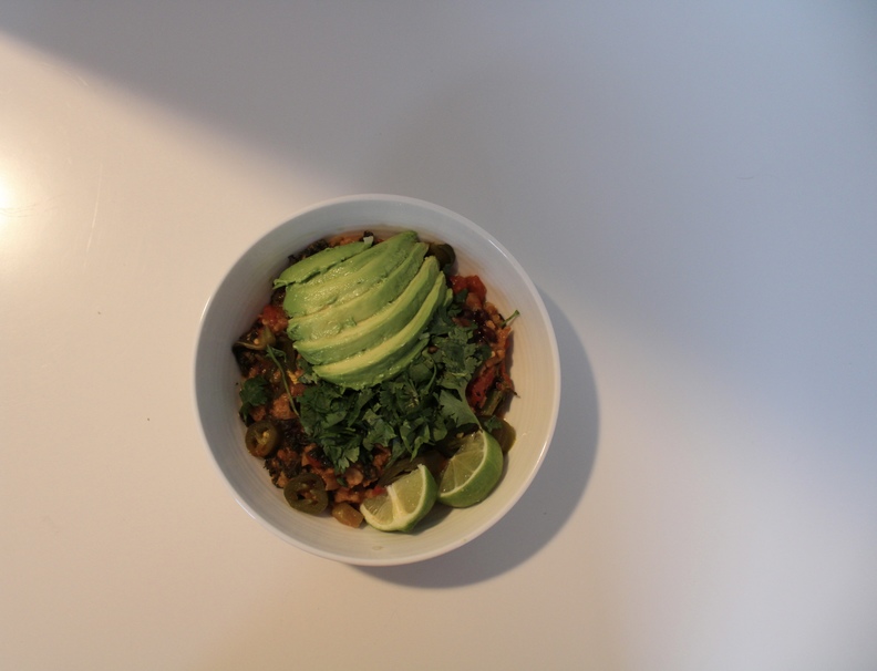 Add everything except for the lime juice, avocado, and cilantro to a pot over medium heat. Bring the mixture to a boil, and then reduce to low so that you don’t see any bubbling in the pot. Set your timer for 10 minutes and allow to simmer uncovered, stirring frequently to make sure nothing sticks at the bottom. After 10 minutes, add lime juice and let sit for another minute. Add the chili into a bowl with any toppings you want. Enjoy!