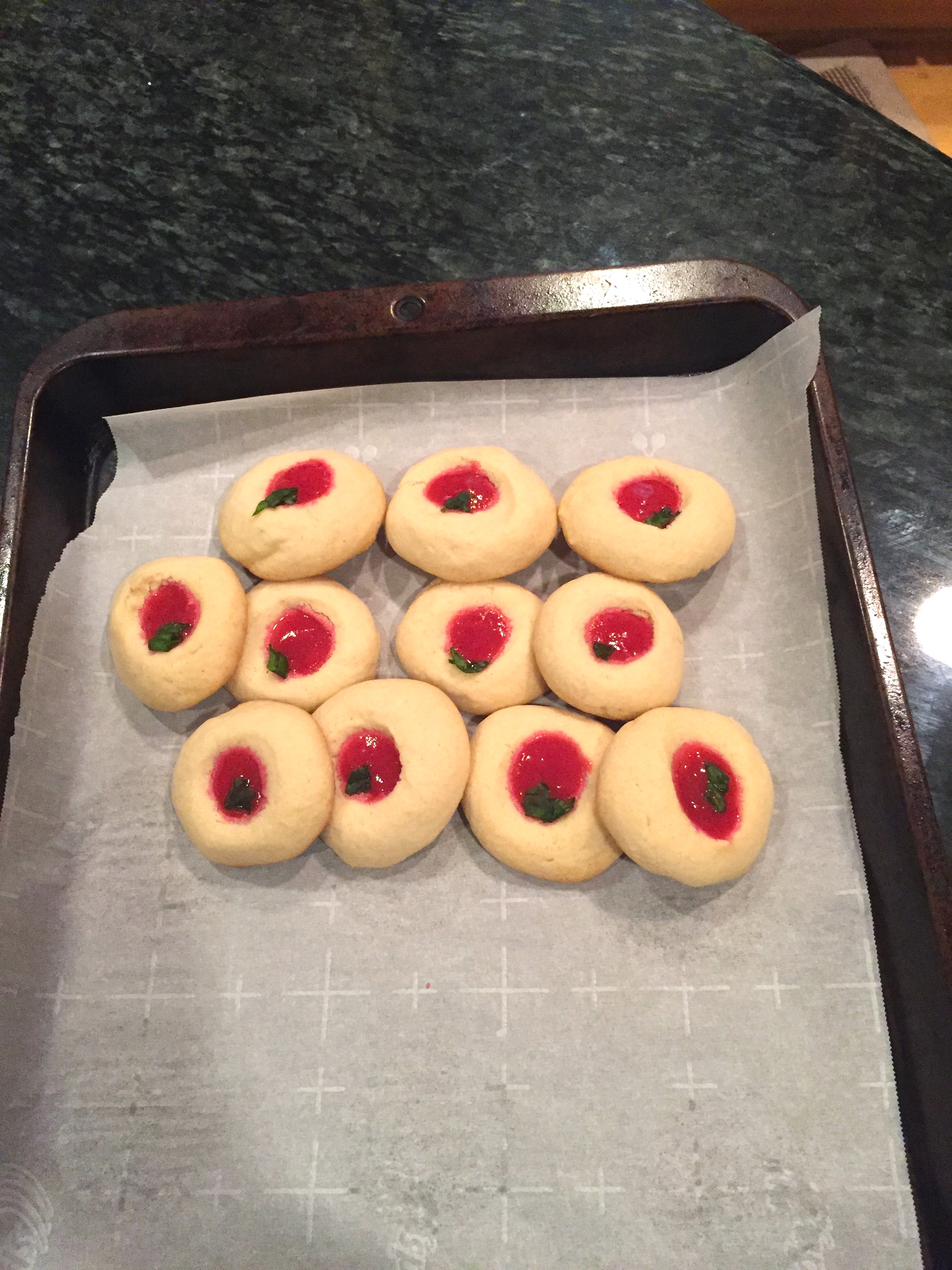 Fill the cookies with the raspberry jam, and garnish with a small piece of basil.