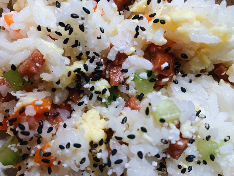 Add rice to large pan. If reheating leftover rice make sure to add 1/4 cup of water. Add vegetables, meat and eggs and stir until mixed completely. Feel free to add furikake or other seasonings for a finishing touch.